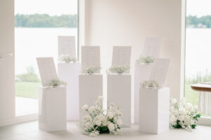 From linens to table numbers, a white wedding color palette is an understated way to set the tone for your big day. Also, keep shades of white in mind when you’re choosing bar decor, welcome signage, votive candles, and furniture for your reception.