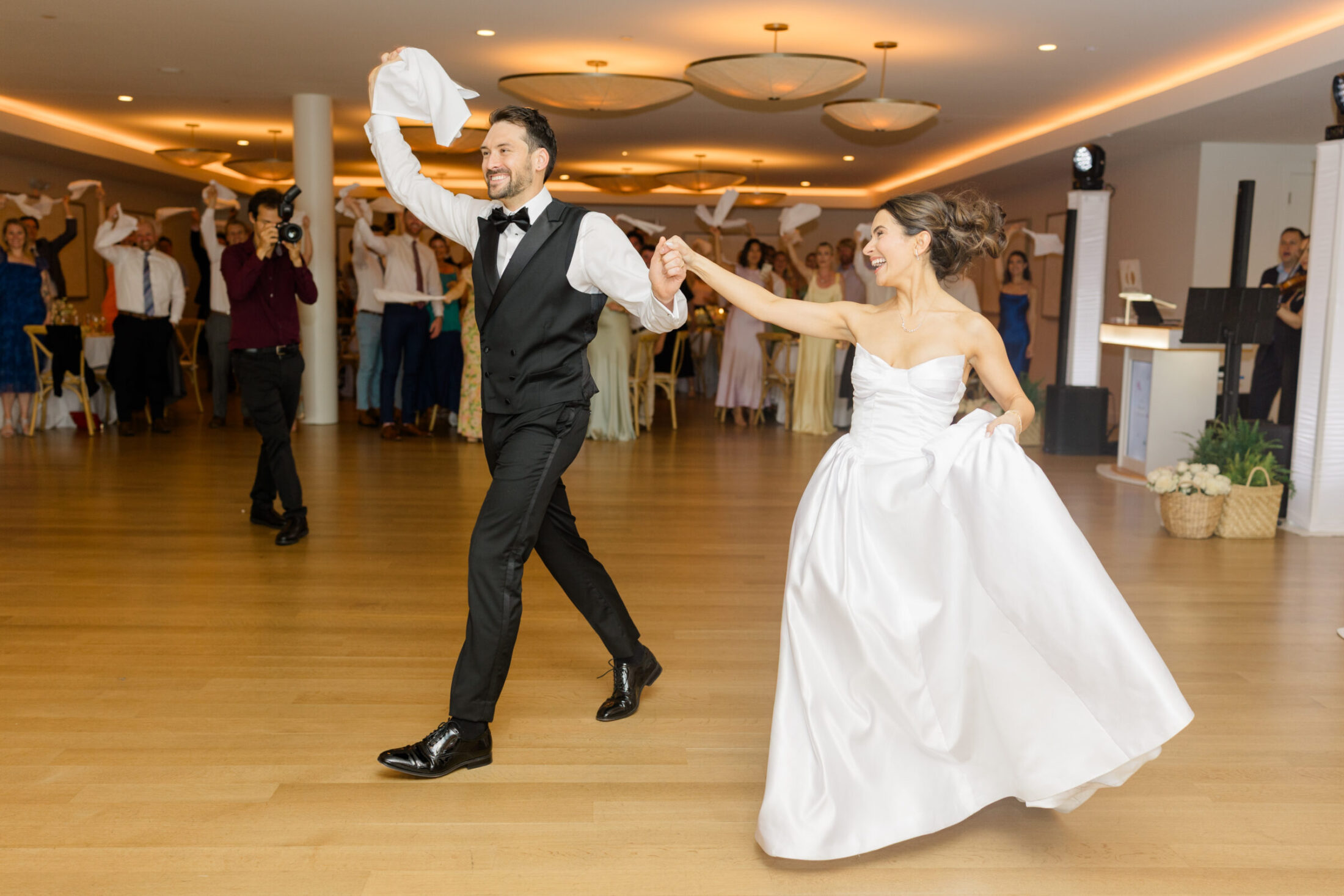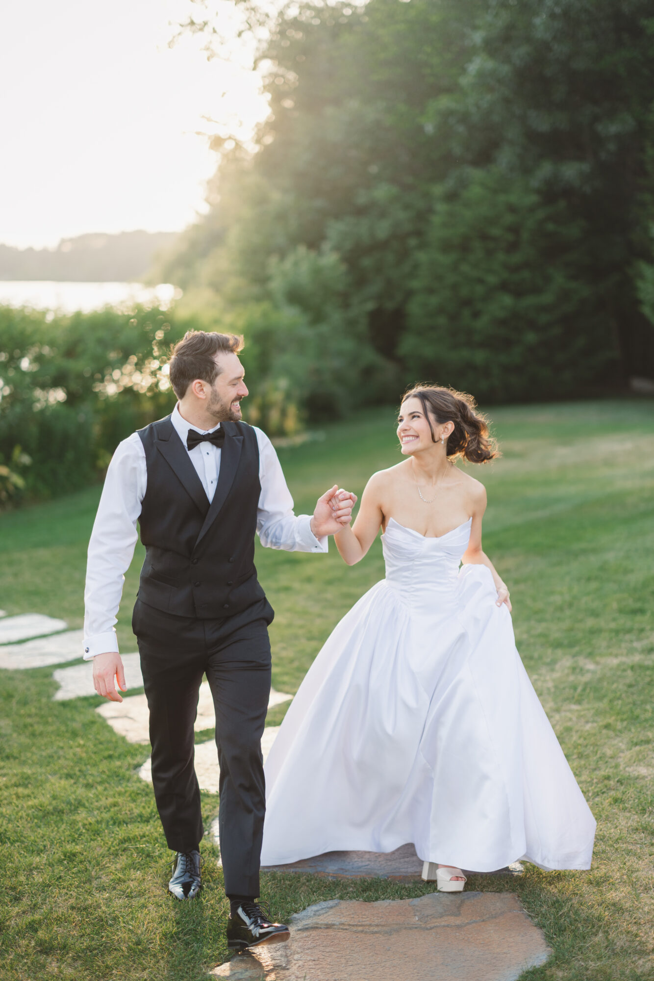 As the celebration continued, Mariela and Gregory made a lively reception entrance that set the tone for the night. Before sunset, they slipped away for photos on the dock and a dreamy cake cutting on the back deck. Framed by the glowing water and evening sky, each moment felt timeless and picturesque.