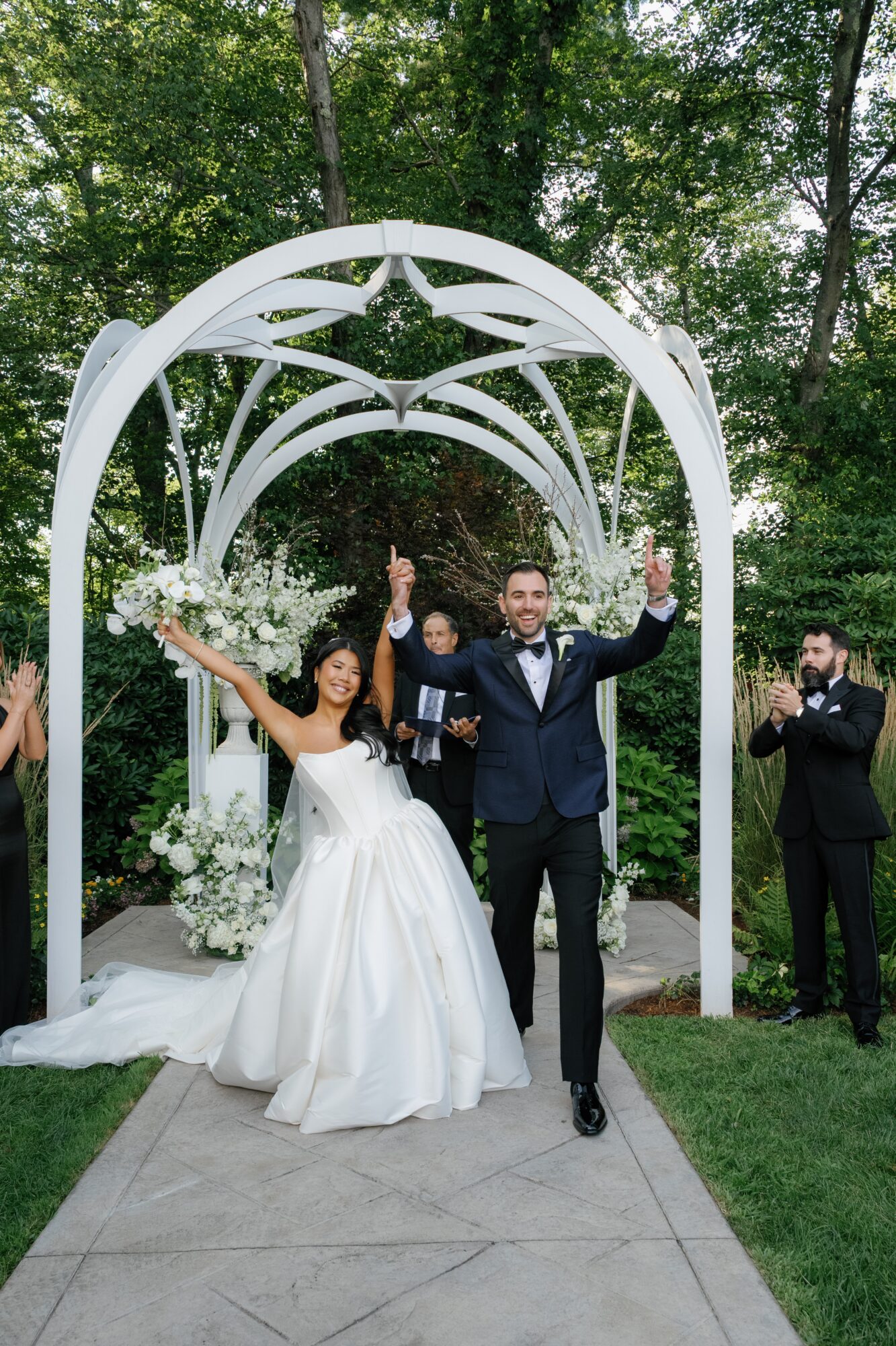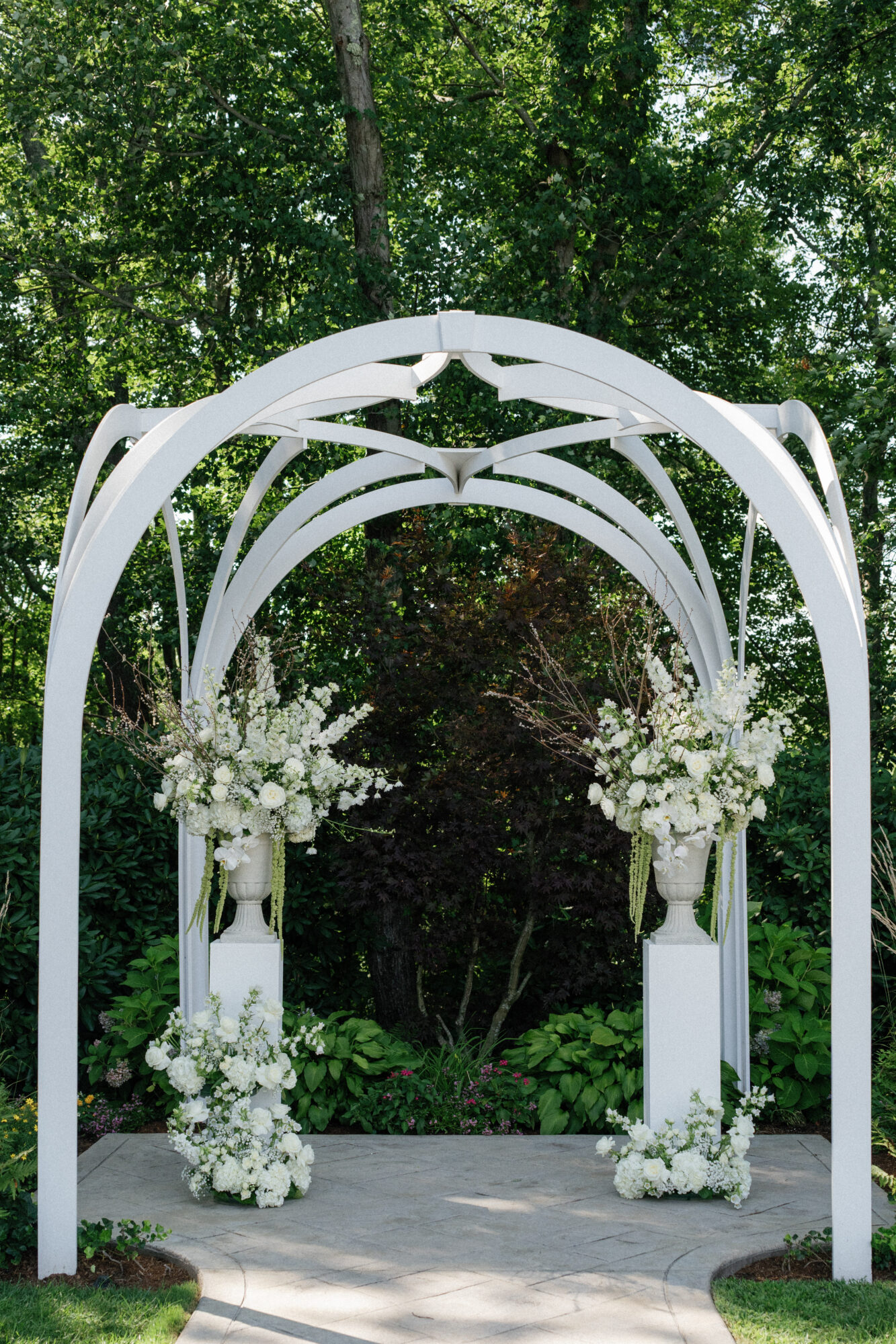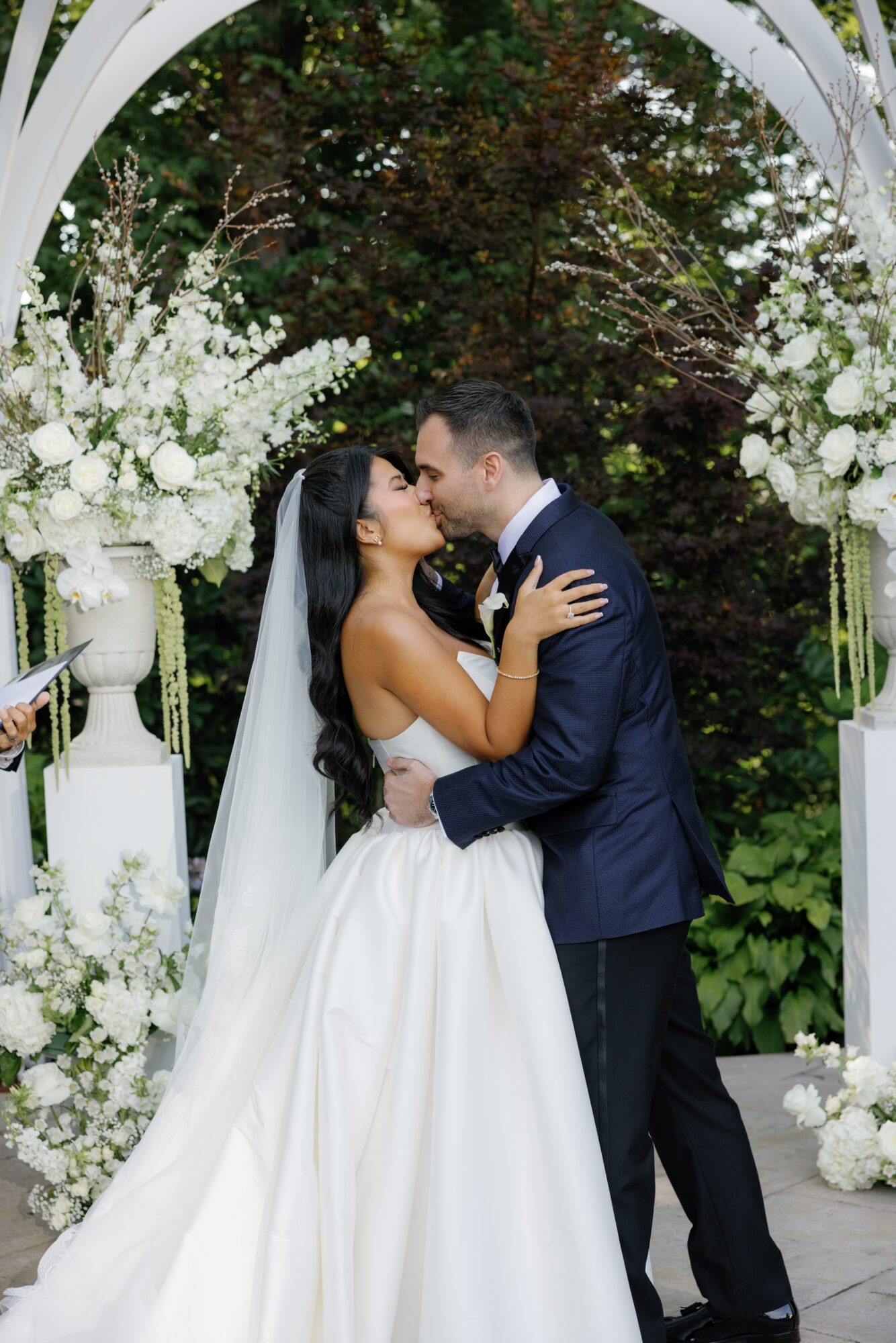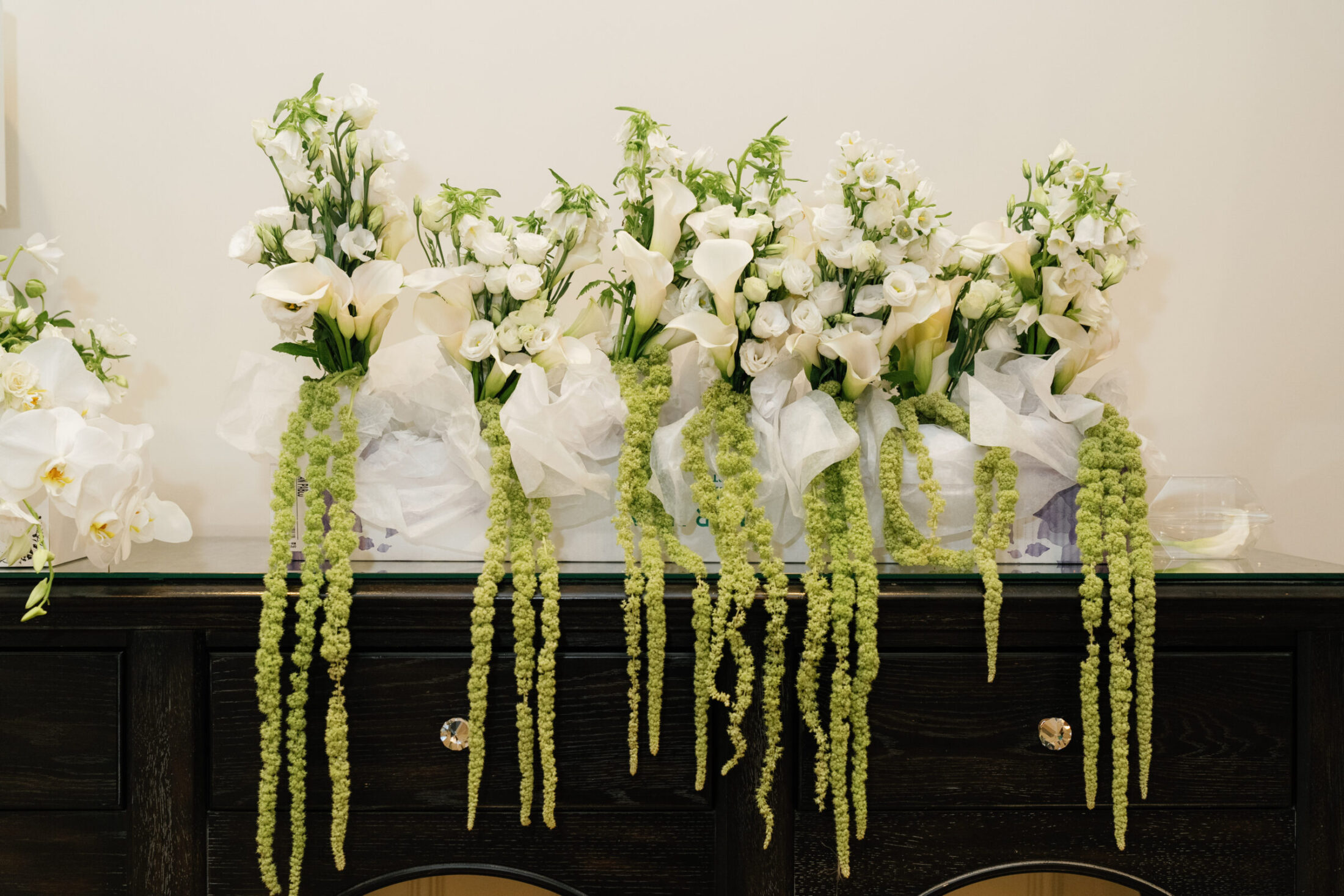 The couple exchanged vows under the pergola, surrounded by friends, family, and plenty of stunning floral arrangements. Bridesmaid bouquets and pedestal arrangements of trailing amaranthus, white roses, and calla lilies added an ethereal element to the ceremony.