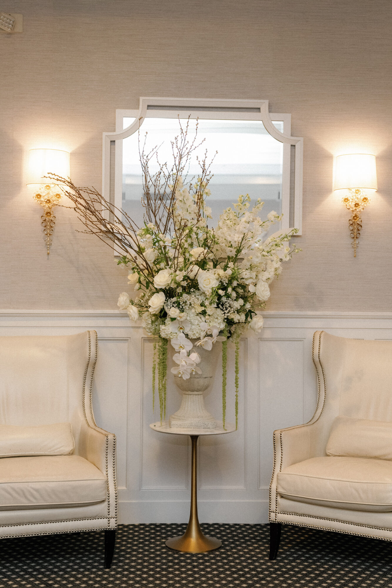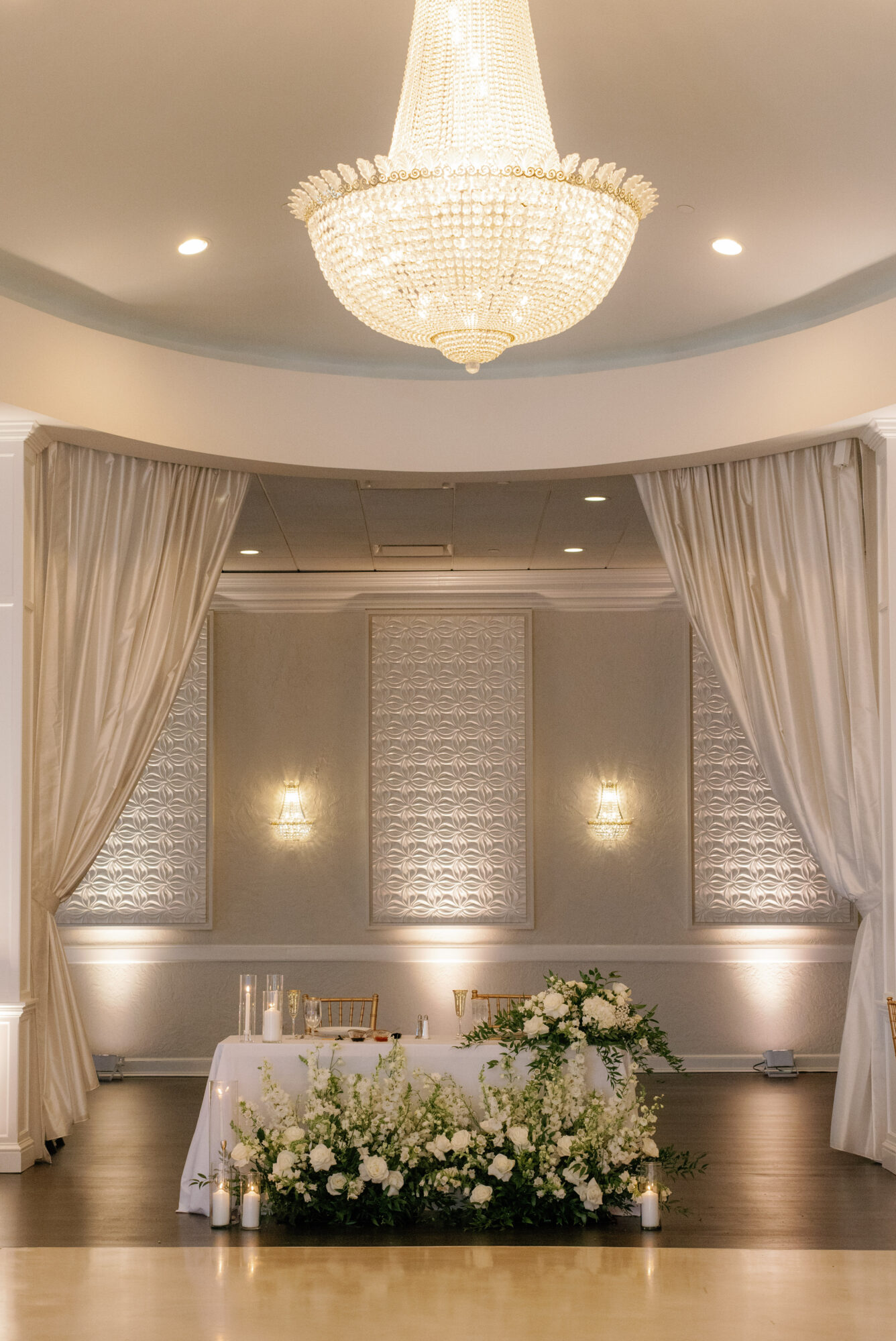 The breathtaking florals continued in the reception space, with arrangements throughout the ballroom, bar, and foyer. A jaw-dropping installation at the sweetheart table was the centerpiece of the reception–topped only by the couple’s romantic first dance.